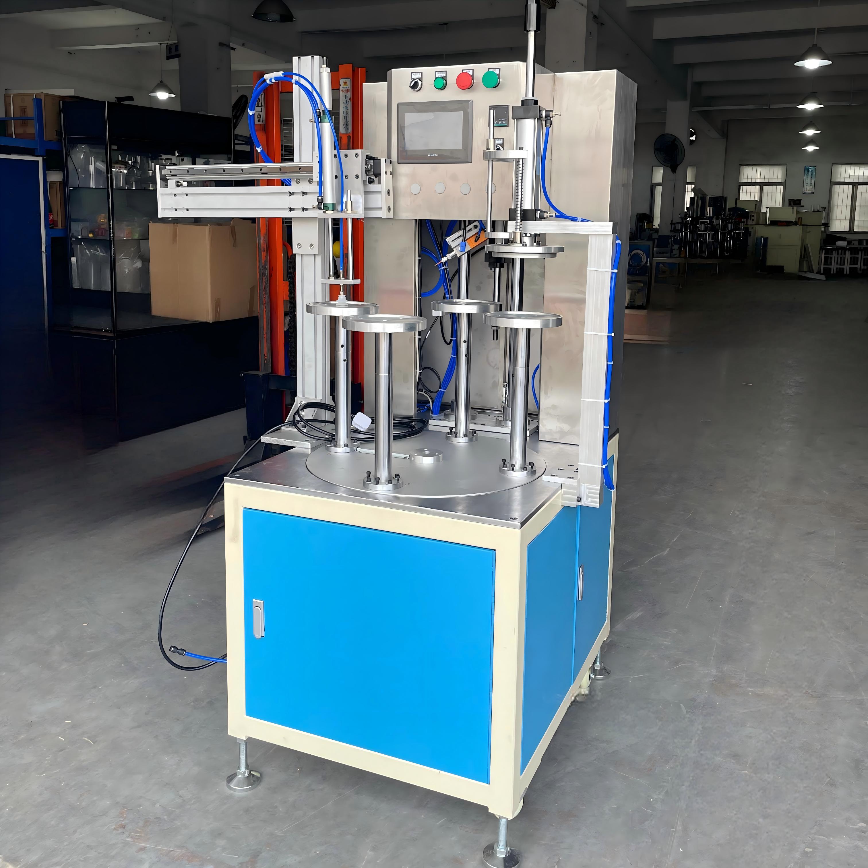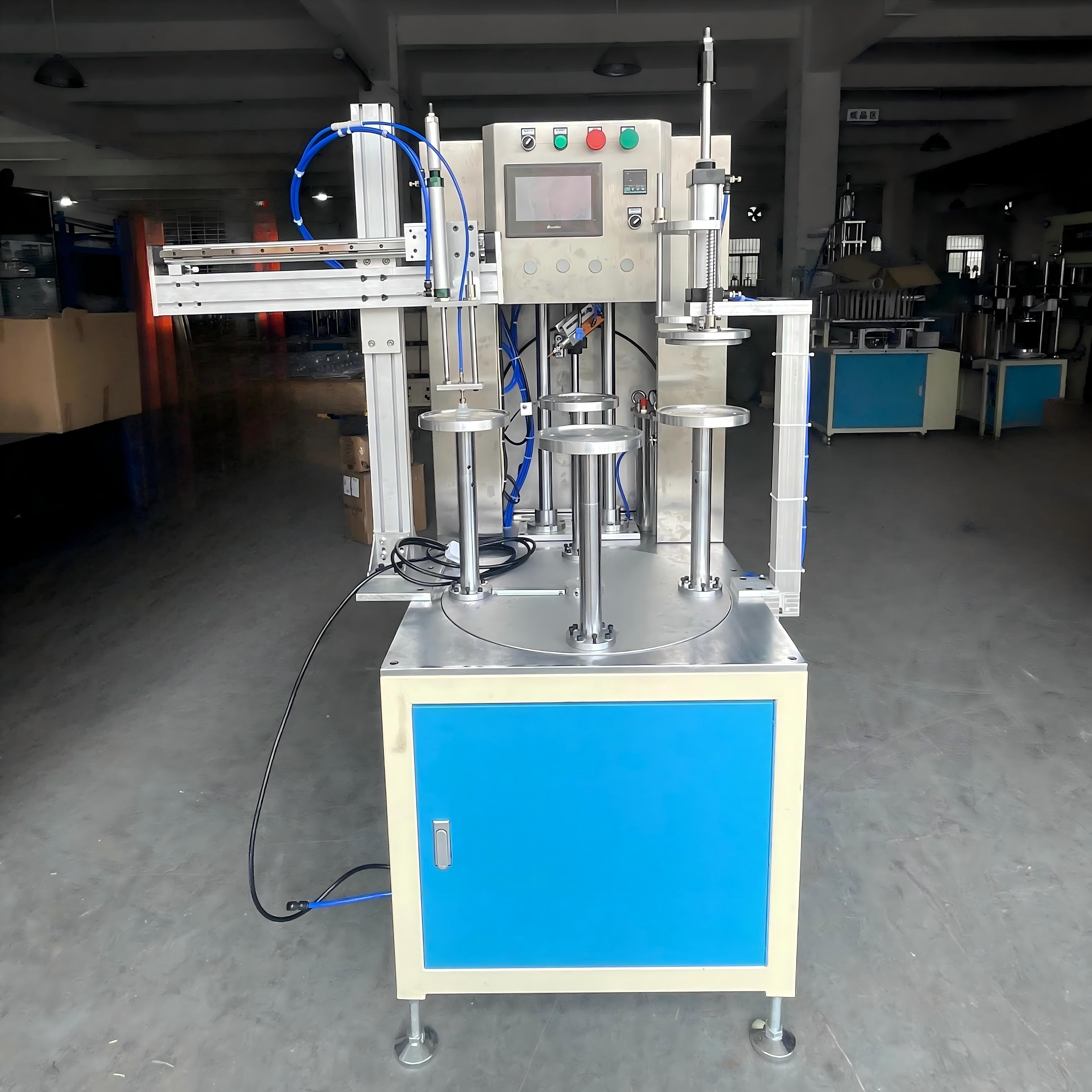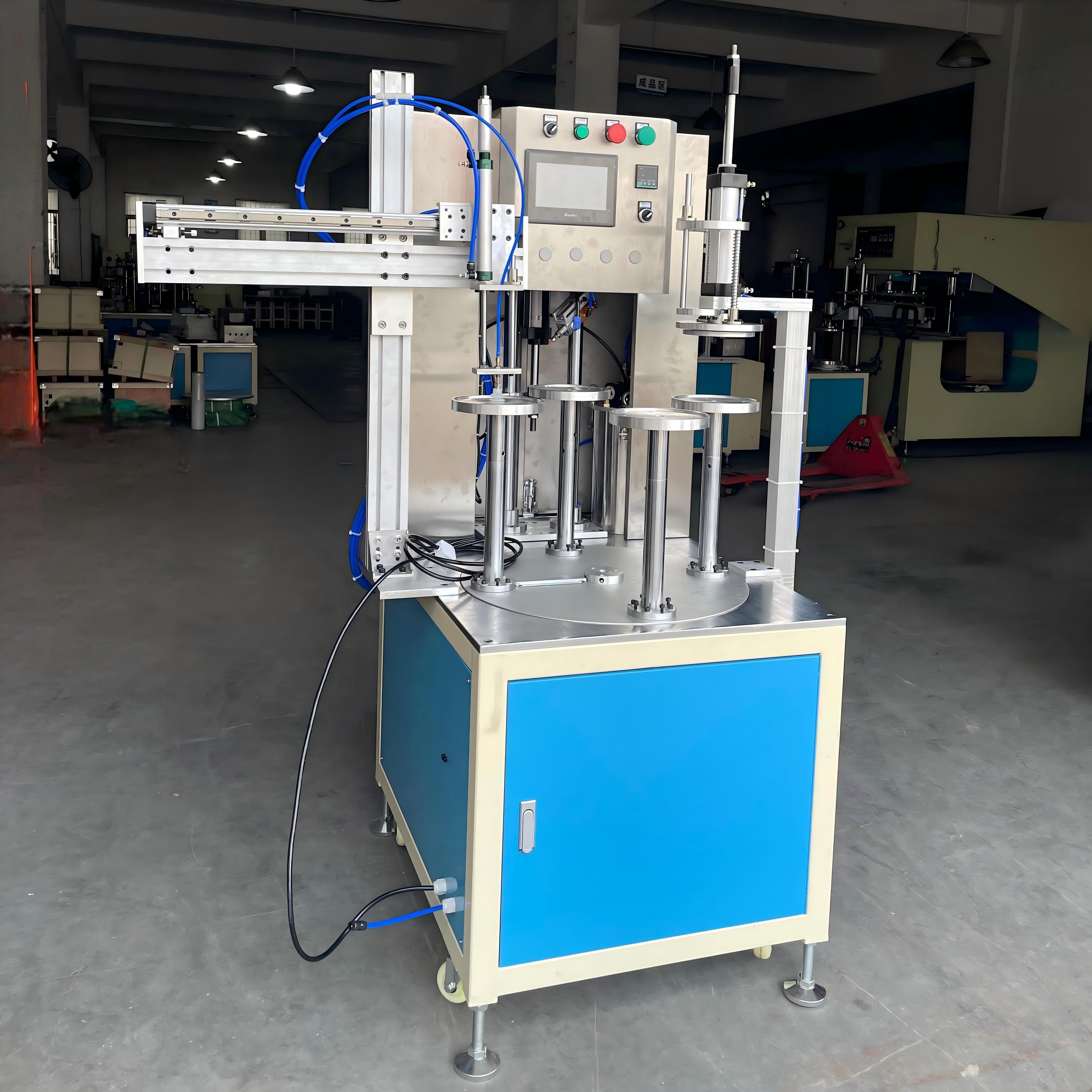 Cylinder-Specific Design: Equipped with curved positioning stations and a rotary gluing mechanism, it ensures even glue coverage on the curved bottom surface, preventing missed or excessive application.